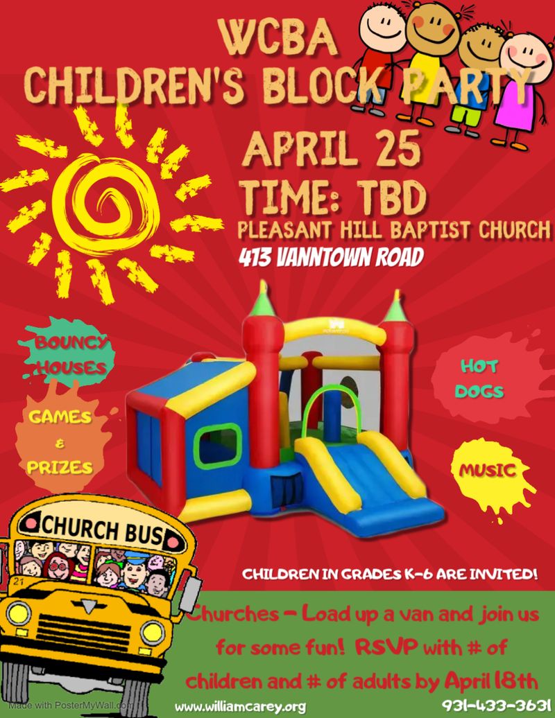 We encourage all churches in WCBA to load up a van of children and join us at the Children's Block Party! To help with planning food and prizes, please RSVP number of children and number of adults to office@williamcarey.org or 931-433-3631 by April 18th.